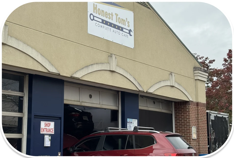 The exterior of a beige auto repair shop building with the sign Honest Tom's Complete Auto Care above two dark blue service bay doors, one of which has a red car driving into it.